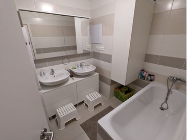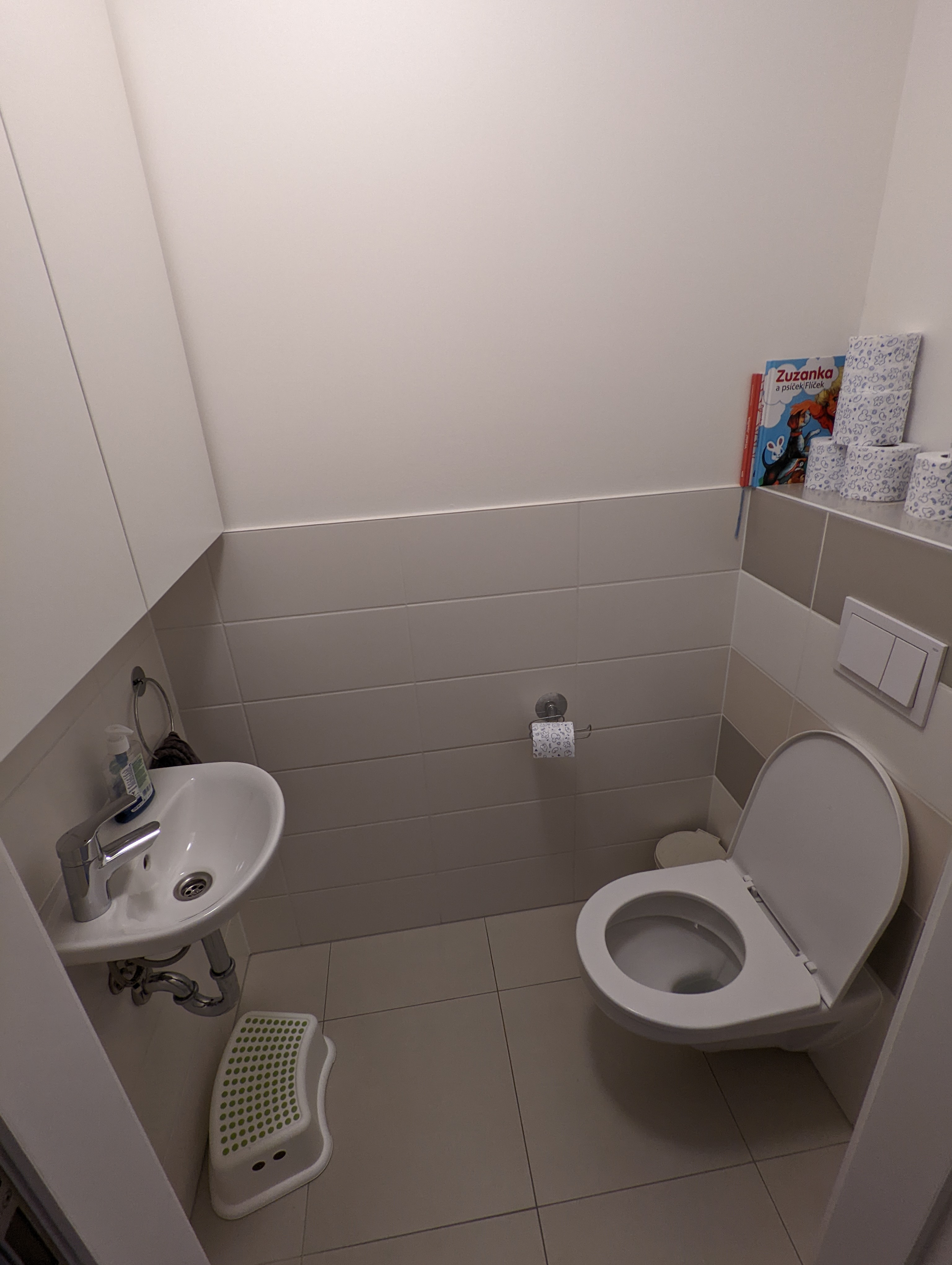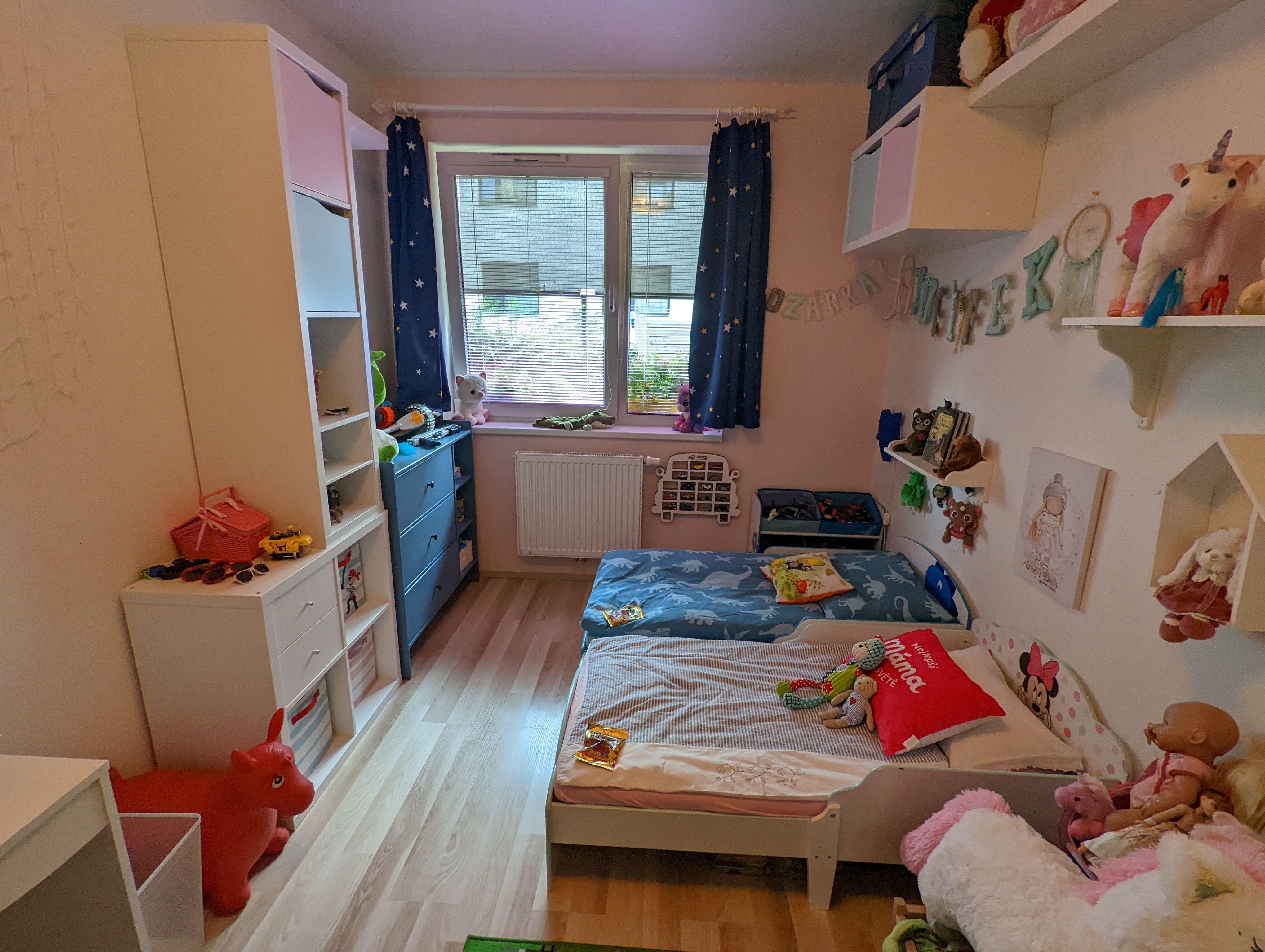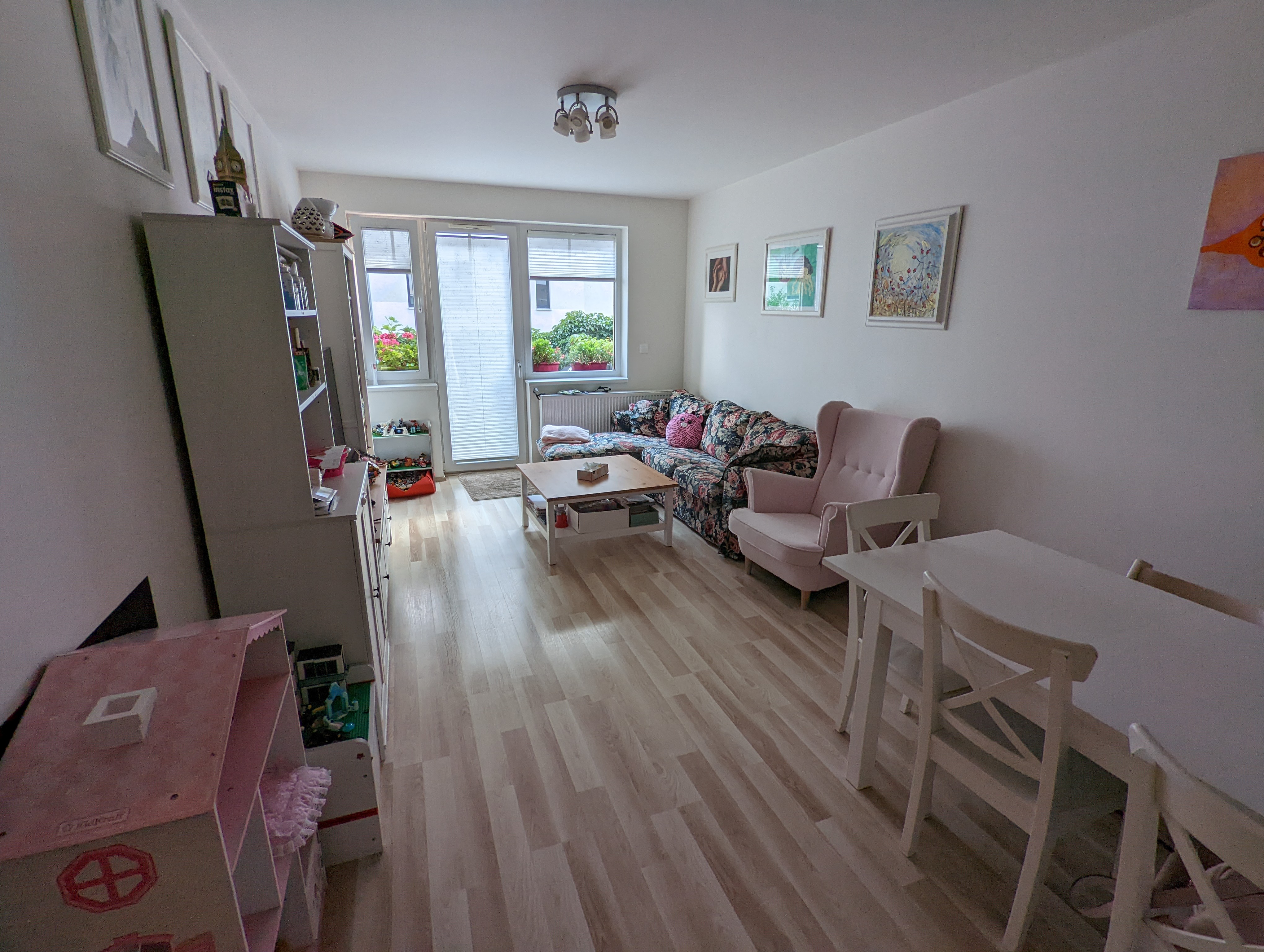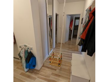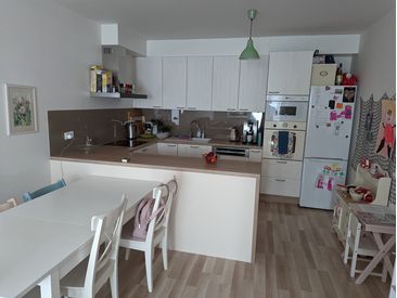 The flat is located in Jahodnice, a quiet part of Prague 14 - Hostavice. This location is well connected to the city centre by trains with the train station situated just 10 minutes of walking distance away. You will find here everything you need for living - just on the same street we have kindergarten, Albert, cafe, wineshop, etc. and you can find kids playgrounds and a lot of green areas in the close vicinity.