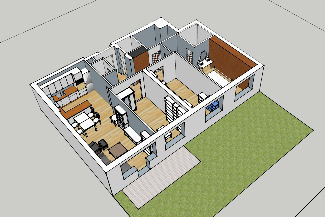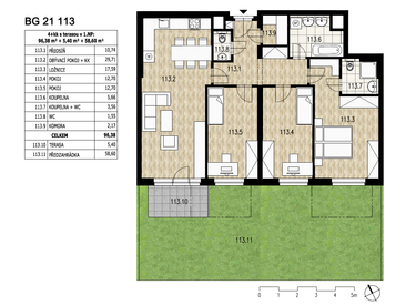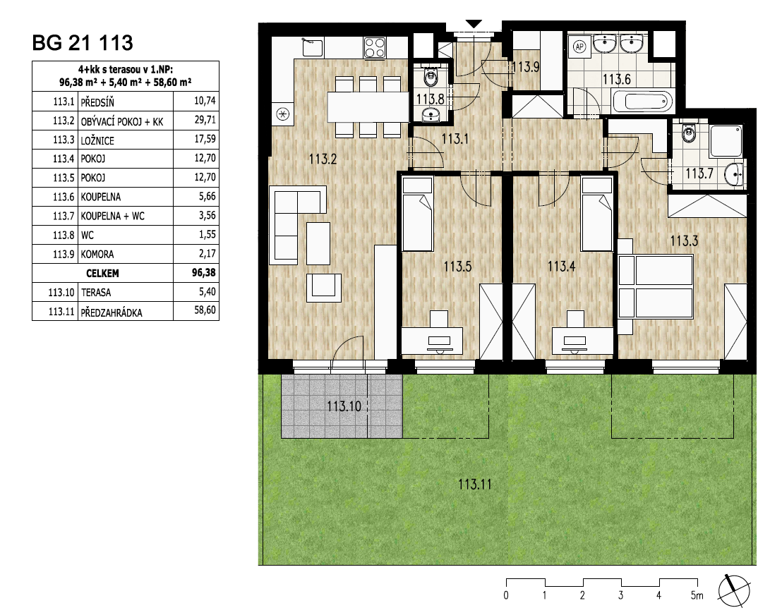 Prostorný byt 4+kk s užitnou plochou 96,38 m² (podlahová plocha podle norem 101,4 m²) se sklepní kójí 3m² a zahrádkou 64m² se dvěma terasami (10m² a 6m²). Byt je umístěn v přízemí, má 4 obytné místnosti, komoru, dvě koupelny a oddělený záchod. Je vybaven kuchyňskou linkou a vestavěnými skříněmi.