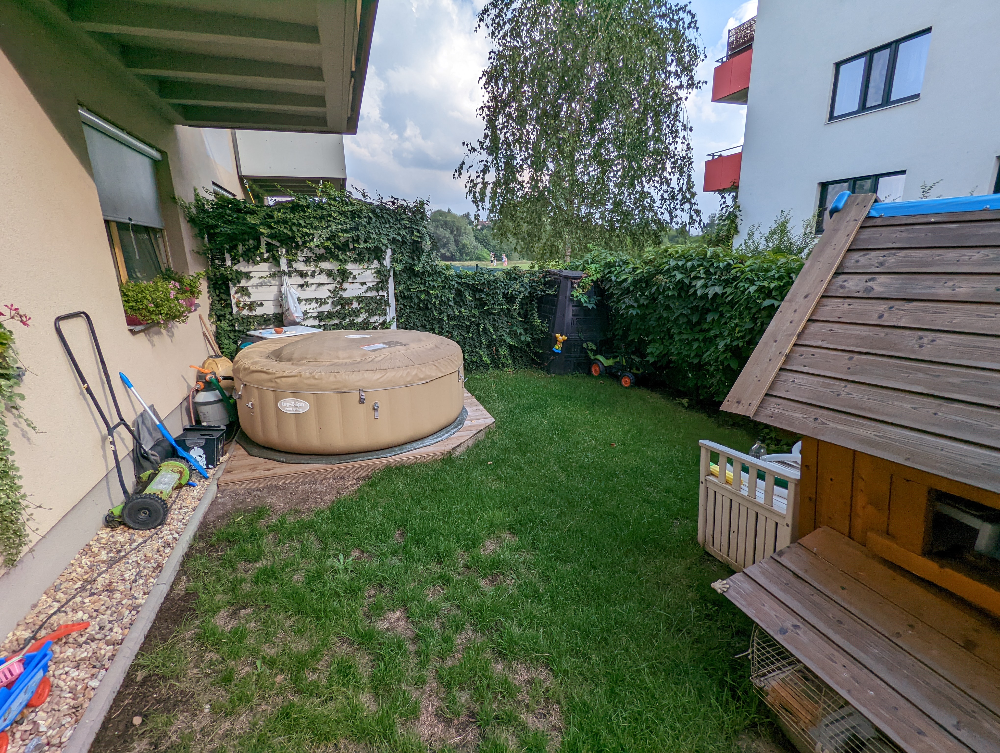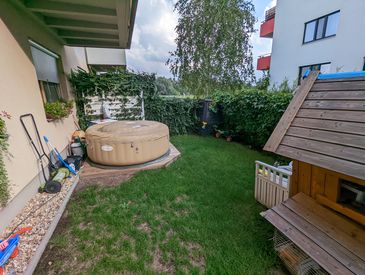 Large flat (96 m² usable area/101m² floor area according to regulations) with 3 bedrooms, 3 bathrooms, living room, closet, separate storage room (3m²) in the building and large garden (64m²) that accommodates two terraces (10m² a 6m²). There is already a kitchen and spacious built-in wardrobes.
